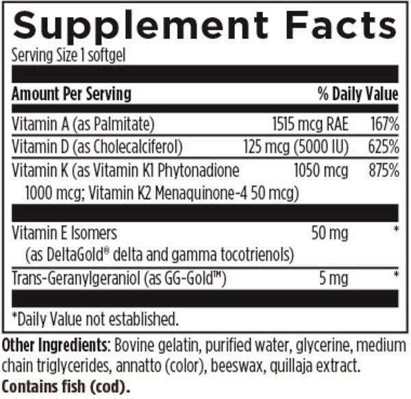 Vitamin E is supplied as isomers, DeltaGold delta and gamma tocotrienols which are naturally derived2. Vitamin K is supplied as K1 (phytonadione) and K2 (menaquinone-4 (MK-4)). The inclusion of Vitamin K with Vitamin D aids in the deposition of Vitamin D into hard tissues and keeps it out of soft tissues like arteries which can decrease artery elasticity and cardiovascular function.