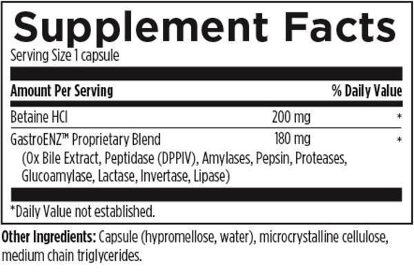 Digestzymes is comprised of a proprietary blend of digestive enzymes along with betaine HCl to support the optimal digestion of proteins, fats, and carbohydrates. This product contains the special protease DPP IV (dipeptidyl peptidase IV), which aids in the breakdown of the peptides gluteomorphin (from gluten) and casomorphin (from casein). Digestzymes™ also includes the enzyme lactase, which helps break down the dairy sugar lactose. The use of Digestzymes™ before meals may be helpful for patients who experience gas and bloating after eating, occasional constipation, or a feeling of fullness after eating only a small quantity of food.